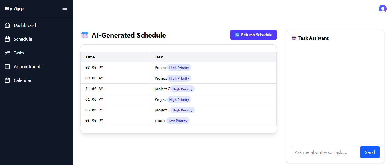 The Task Management Web App is a smart productivity solution designed to streamline planning and execution. With an AI-powered scheduler, it automatically prioritizes and organizes tasks based on time and importance. Developed with Next.js, Clerk, and MongoDB, and powered by the Google Gemini 2.5 API, the app combines modern web technologies with artificial intelligence to deliver an efficient and user-friendly experience.
